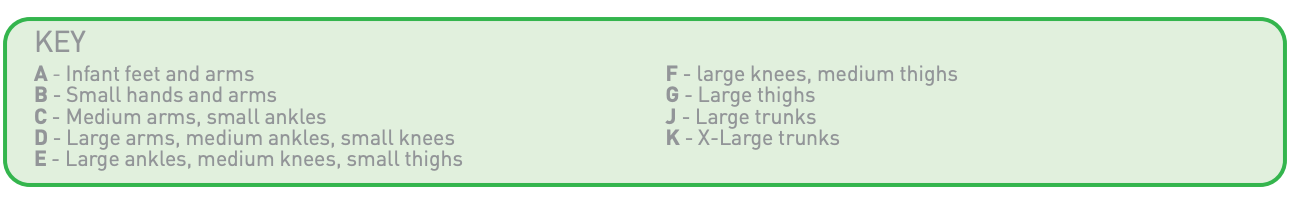 | F | 10 cm | Up to 36 cm limb circumference | Large legs, small thighs |